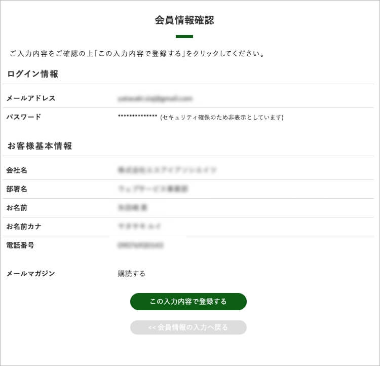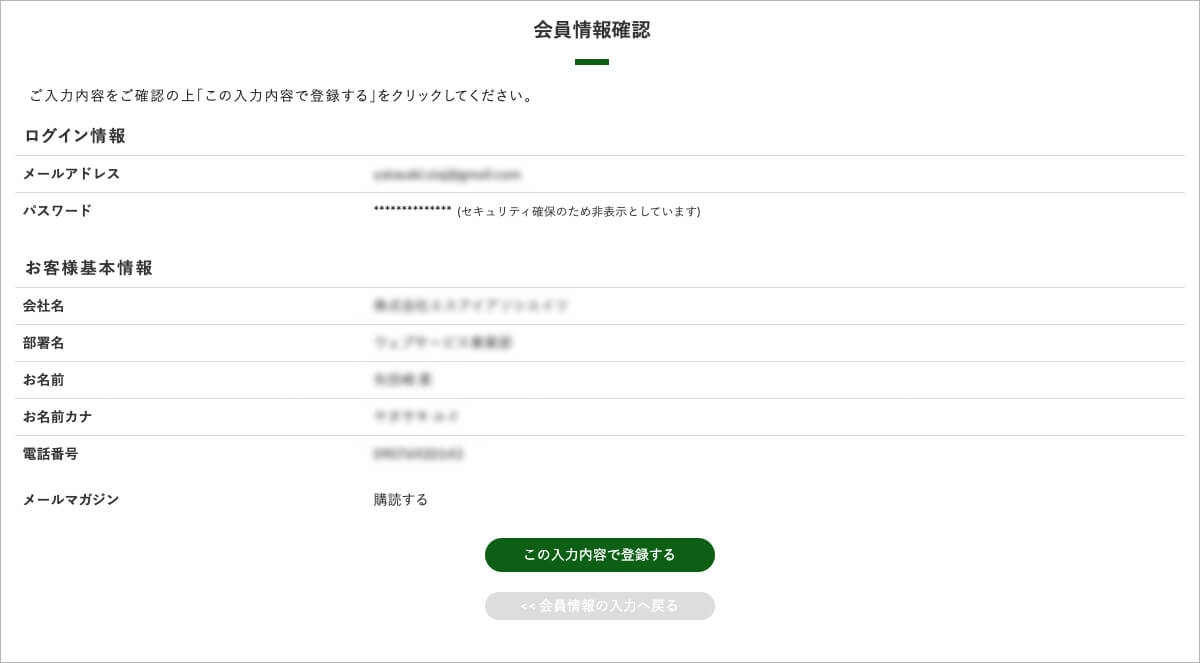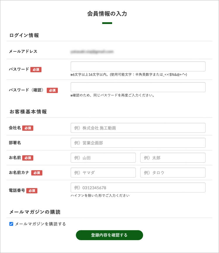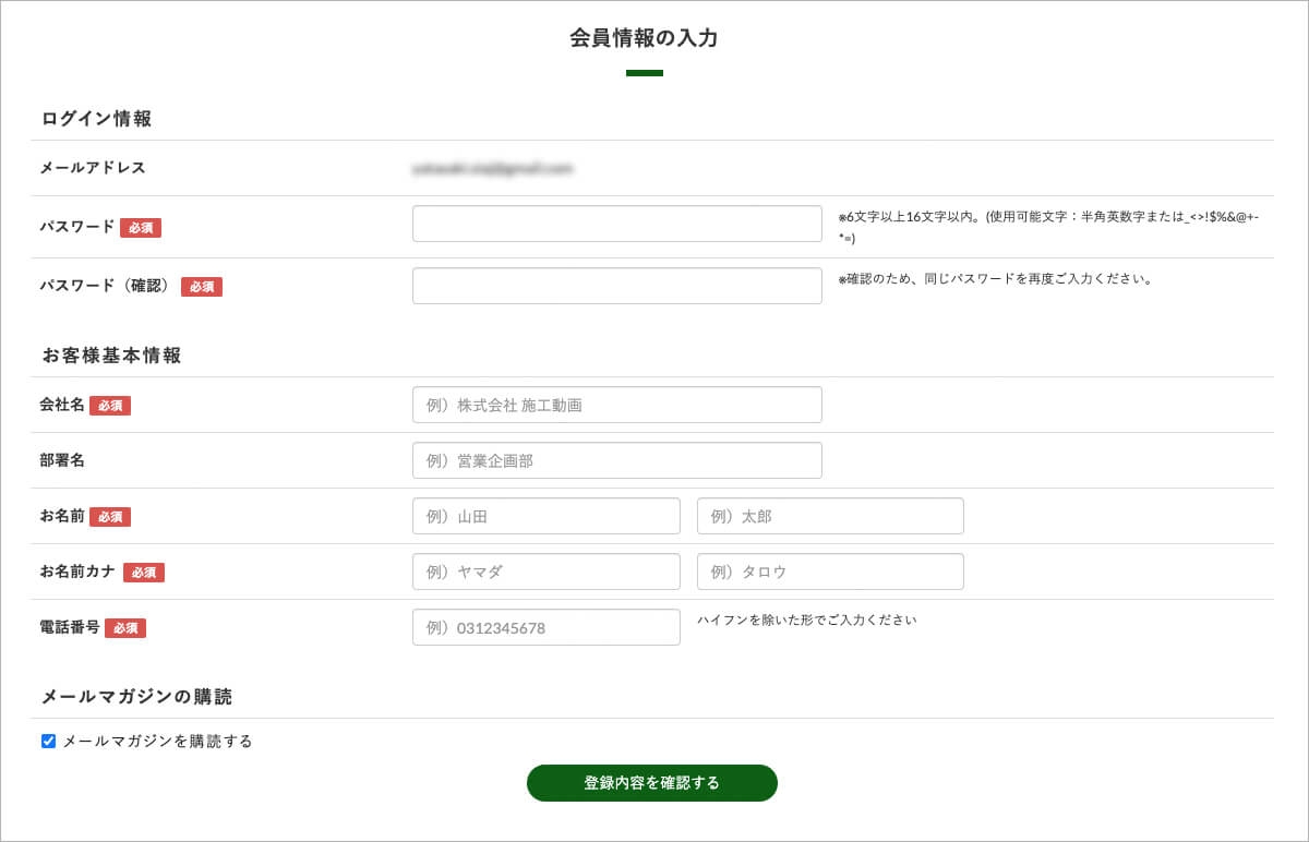 送付されたメール内の本会員登録URLをクリックし、ログイン情報(必須)、お客様基本情報(必須)を入力ください。登録内容を確認の上、登録ボタンをクリックすると本会員登録完了です。なお、メールアドレス、パスワードは、次回からのログイン時に必要となりますので、大切に保管ください。