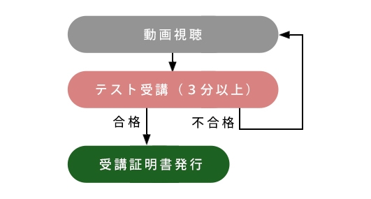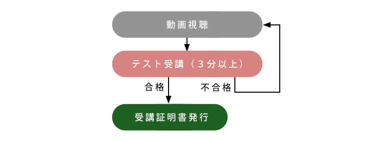 購入動画は、初回の再生では早送り・巻戻しはできません(一時停止は可能)ので、ご了承ください。動画再生を途中でやめる場合は、必ず左下の動画停止ボタンを押してください。左下の動画停止ボタンを押さないで画面を閉じると、動画再生が最初に戻る場合があります。2回目以降の再生からは、早送り・巻戻しが可能です。また、複数のデバイスで同時にログインすると、不具合が生じる場合がありますので、ご注意ください。動画視聴終了後、テスト受講となります。テストは、表示から3分経過しないと回答できません。また、テストに回答せず終了、もしくはテストに合格できなかった場合は、動画の最初に戻ります。