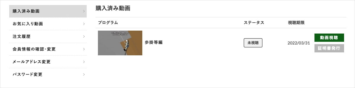ログイン後、マイページ画面では購入済み動画一覧、お気に入り動画一覧、注文履歴一覧を確認することができます。また、会員情報、メールアドレス、パスワードの変更も可能です。