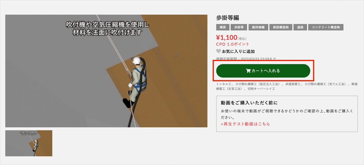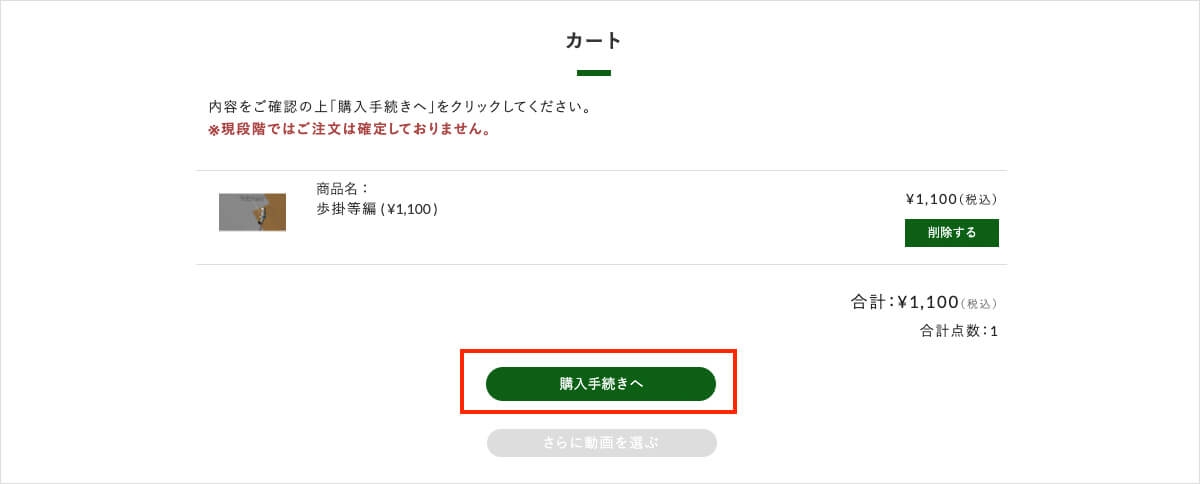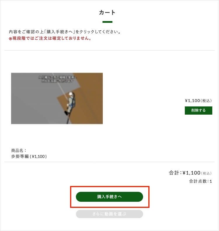 動画一覧から購入したい動画のサムネイルをクリックし、商品詳細画面から「カートに入れる」を選択し、購入手続きを行ってください。(動画は、複数選択可)