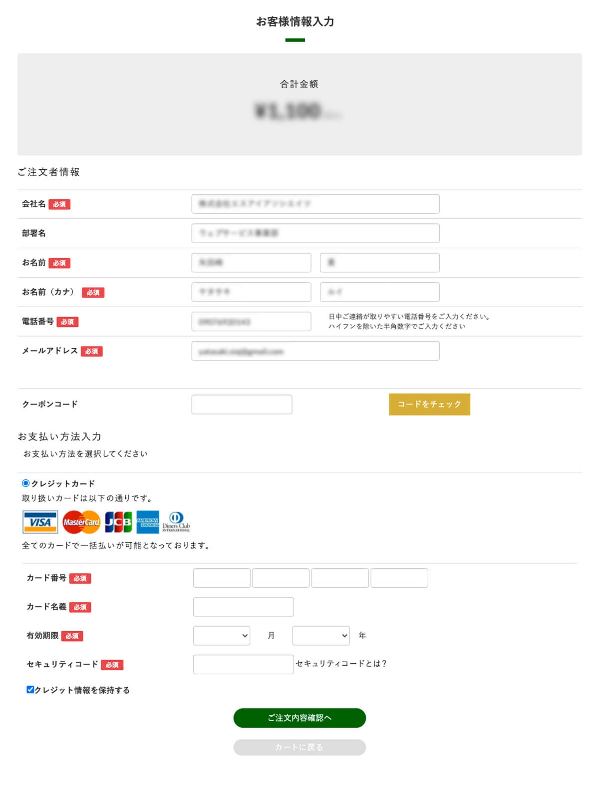 お支払方法はクレジットカード決済となります。お支払い情報を入力し、内容確認の上、注文ボタンを押下ください。(お支払い情報の入力は、初回のみとなります)なお、クーポンをご利用される方は、クーポンコードを入力し、右側にあるコードをチェックを押下ください。