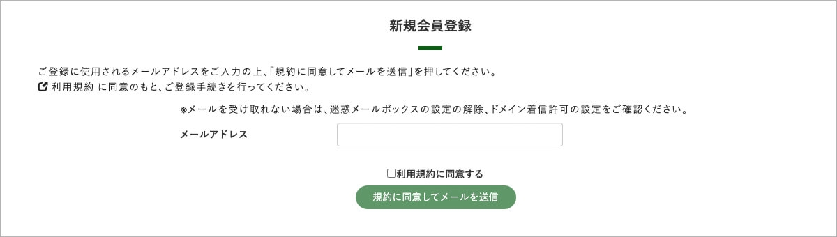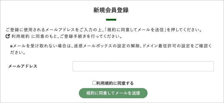 ご利用者のメールアドレスを入力し、「規約に同意してメールを送信ボタン」をクリックすると、入力メールアドレス宛に本会員登録URLが記載されたメールが送信されます。